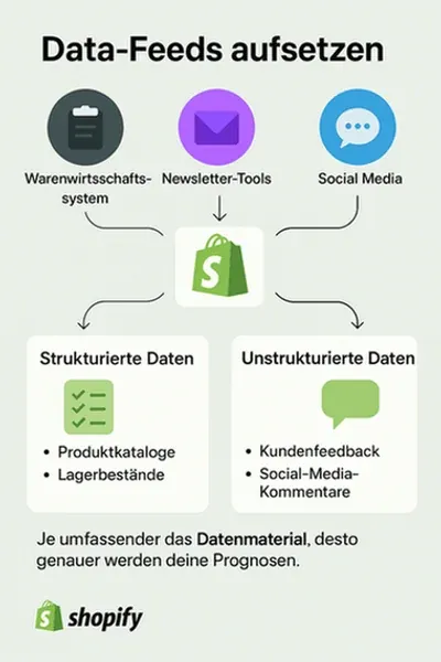 Damit Shopify Predictive Analytics verlässliche Prognosen liefern kann, sind hochwertige Daten unverzichtbar. Dabei unterscheidet man zwischen strukturierten (z. B. Shop-Kategorien, Preise) und unstrukturierten Daten (z. B. Kunden-Kommentare in Social Media).