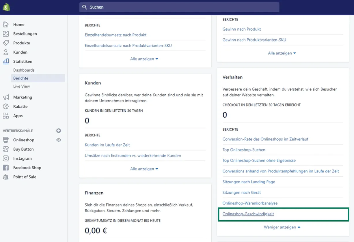 So findest du den Geschwindigkeitsbericht bei Shopify