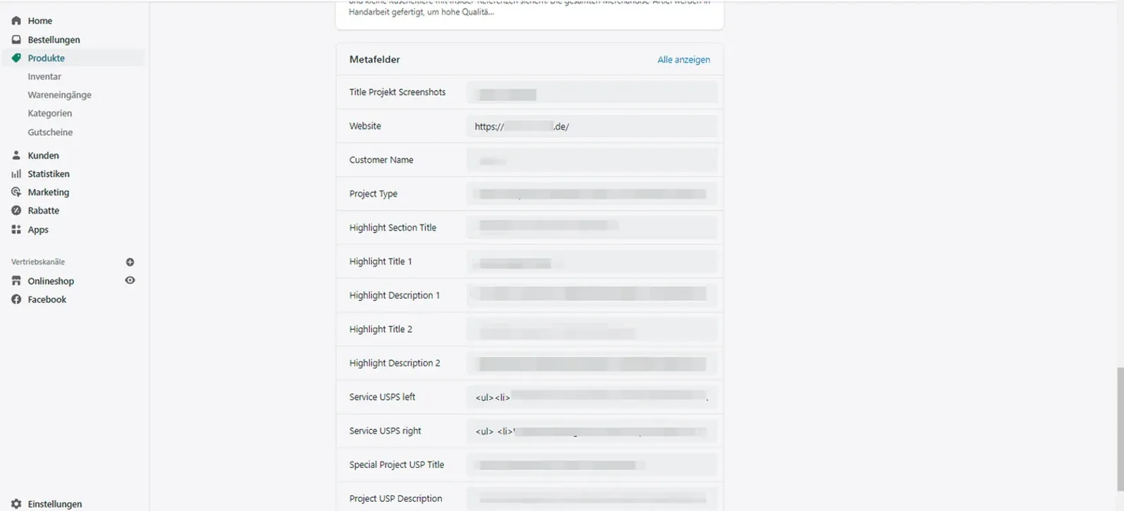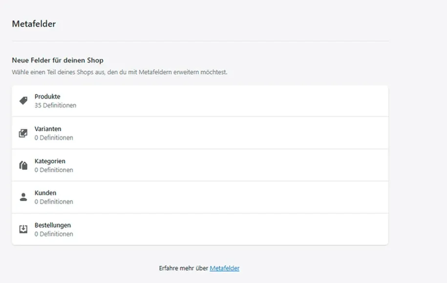 Mit Metafields kann man benutzerdefinierte Felder zu Produkten, Produktvarianten, Kategorien, Kunden und Bestellungen, Seiten, Blogs und Blog-Beiträgen hinzufügen. Sie helfen, zusätzliche Informationen zu deinem Shop hinzuzufügen, die nicht in der Grundausstattung von Shopify enthalten sind.