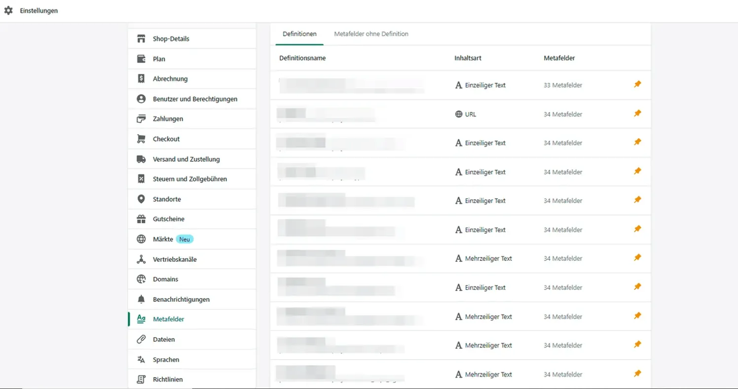 Anpinnen: Wenn du willst, dass deine Metafields beispielsweise bei deinen Produkten/Kategorien im Backend stets als Eingabemöglichkeiten angezeigt werden, kannst du sie anpinnen. Dafür musst du einfach auf dieses Symbol klicken: