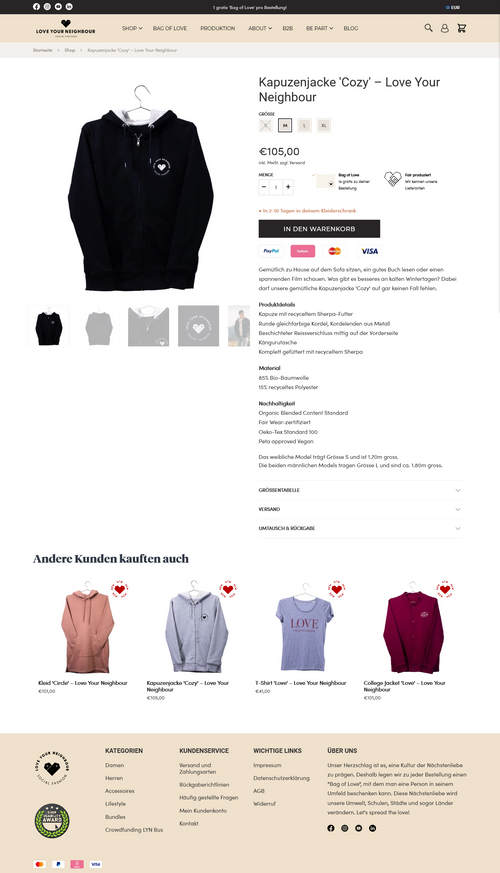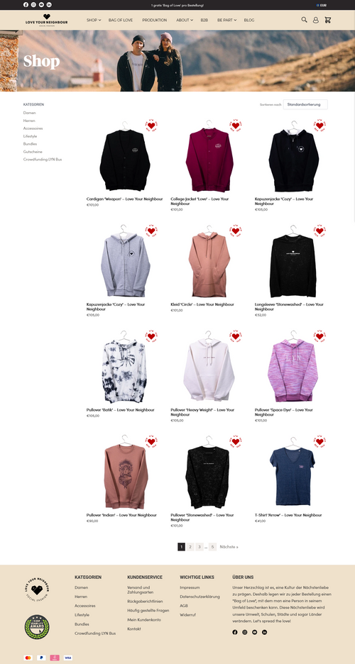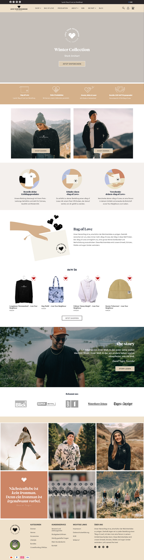 2013 gründete der Schweizer Unternehmer David Togni das Modelabel "LOVE YOUR NEIGHBOUR" mit dem Ziel, Nächstenliebe in der Welt zu verbreiten. Das Sortiment reicht für eine komplett neue Garderobe: Von Hoodies und T-Shirts über Caps und Ketten, bis hin zu Socken und Taschen ist alles dabei.